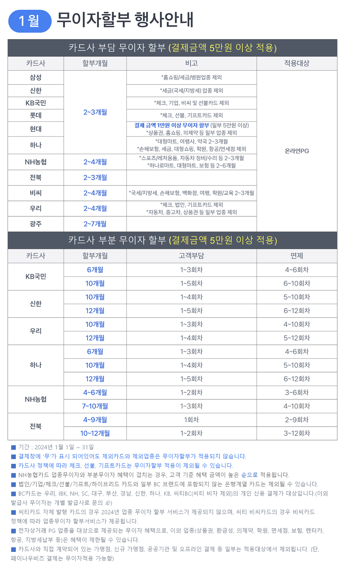 24.02.01 ~24.02.29 | 현대카드 | 5만원 이상 | 2~3개월 | 별도 신청 없이 적용 | PG업종만 제공 |